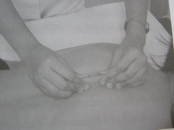 - วิธีที่ 1 วางนิ้วก้อย กลางและนิ้วชี้แนบแนวกลางกระดูกสันหลัง พร้อมปลายนิ้วชี้ หัวแม่มือบีบกล้ามเนื้อไขสันหลัง ( Erector spinous ) เข้าหากันทำพร้อมกันทั้งสอง