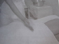 5. เลื่อนผ้าห่มมาบริเวณก้นกบ ปูผ้าเช็ดตัวทับบนผ้าห่ม ถ้าผู้ป่วยนอนตะแคงให้ปูผ้าเช็ดตัวตามแนวยาวแนบหลังผู้ป่วย